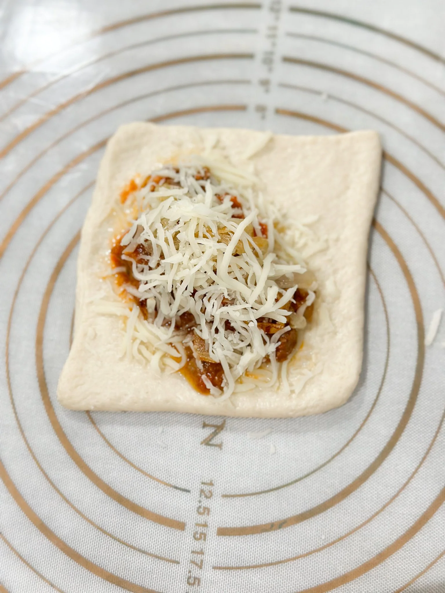 Roll out pizza dough (I used the Pillsbury pizza crust in this recipe for an easy option, but it was not my favorite to work with! Very wet and difficult. I tried it again the next day with a homemade crust - much better). You want your calzone dough to be fairly thin, but not thin you can see through it. Cut the dough into squares (size as you wish). Layer cheese, sauce, onion, then cheese again diagonally on the dough square. Try not to overstuff!